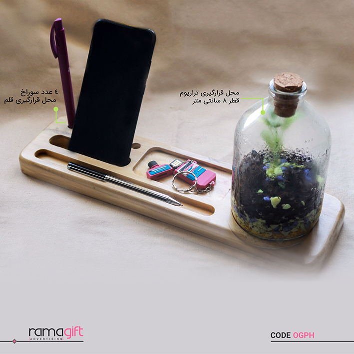 تراریوم + نظمدهنده چوبی کد OGPH یک ترکیب عالی از نظمدهی و زیبایی طبیعی است. این ست چوبی با طراحی خاص خود شامل چهار جایگاه برای خودکار، جاکلیدی و سایر وسایل کوچک، فضای کار شما را منظم و مرتب نگه میدارد. بخش جالب توجه این ست، گلدان شیشهای بطریمانند آن است که بهعنوان یک تراریوم یا گلدان دکوری کوچک برای گیاهان مورد استفاده قرار میگیرد. چاپ لوگو روی چوب و کنارههای آن، این محصول را به یک انتخاب عالی برای هدیههای تبلیغاتی و سازمانی تبدیل میکند.