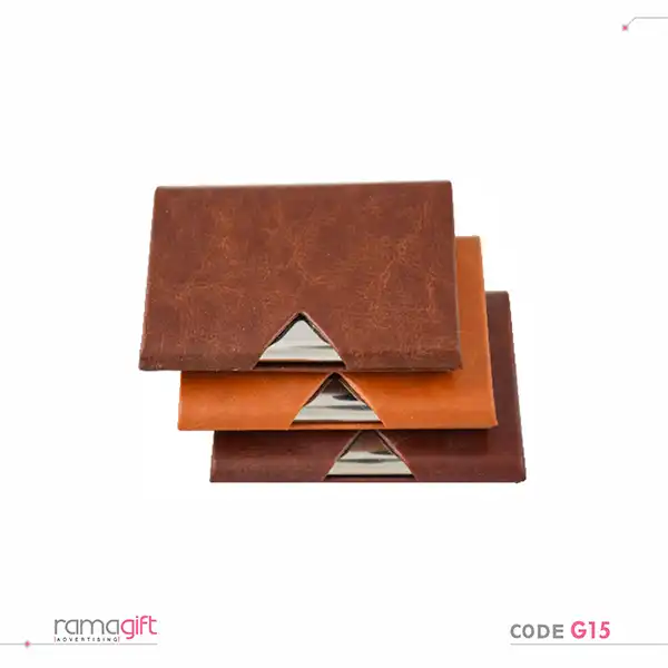 جاکارتی تبلیغاتی کد G15 از ترکیب چرم مصنوعی و فلز ساخته شده و طراحی خاص و مدرنی دارد. درب آن از قسمت پایین و به صورت عمودی باز میشود. در بخش میانی جاکارتی، یک قسمت مثلثی طراحی شده که فلز زیرین را به نمایش میگذارد و همین جزئیات ساده باعث شده ظاهر این محصول بسیار مدرن، خاص و جذاب باشد. رنگبندی چرم و فلز در این مدل متنوع است و شامل رنگهای مشکی، نقرهای، طلایی و سایر رنگهای سفارشی میشود. فرم مستطیلی و ترکیب ظریف فلز و چرم جلوهای لوکس و مدیریتی به آن بخشیده است.