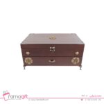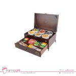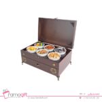 این جعبه چوبی پذیرایی از دو طبقه متفاوت ساخته شده ، که بخش بالایی آن دارای 6 کاسه چینی و در طبقه پایین جعبه که به صورت کشویی میباشد دارای پنج محفظه و در اندازه مختلف است .درب این هدیه تبلیغاتی به صورت خاصی از یراق آلات برای زیبایی این محصول استفاده شده است.