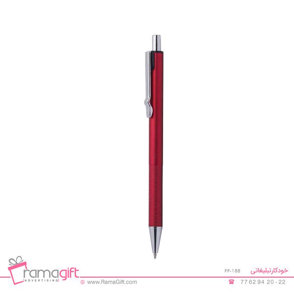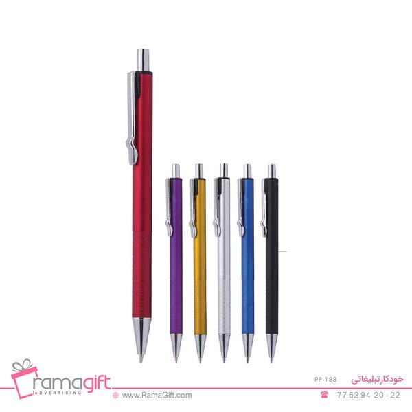 خودکار تبلیغاتی پلاستیکی PP-188 با رنگ های متنوع بدنه شامل : قرمز ، بنفش ، زرد ، سفید ، آبی ، مشکی با گیره و نوک فلزی به این خودکار ظاهری جذاب بخشیده است . خودکار عضو همیشگی کیف است بهمراه داشتن یک خودکار تبلیغاتی با کیفیت برای ثبت اتفاقات روزمره مثل نوشتن آدرس یا شماره تماس ضروری است .