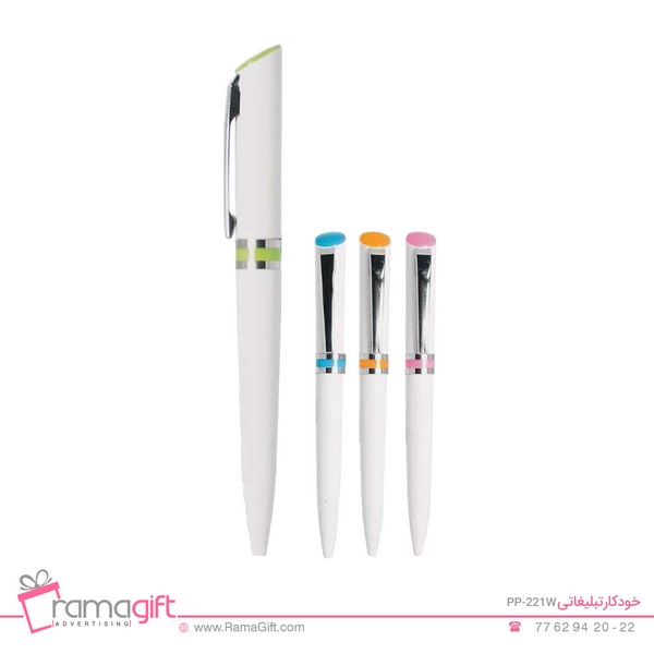 خودکار تبلیغاتی پلاستیکی PP-221W ، خودکاری است با بدنه سفید که حلقه وسط و گیره این خودکار در رنگ های مختلف توزیع می شود . نوشت افزاری بسیار روان و خوشدست و راحت است . بر روی بدنه این خودکار گیره وجود دارد که آن را به وسیله ای قابل حمل در جیب پیراهن تبیدیل کرده است . نوک خودکار تبلیغاتی پلاستیکی با پیچاندن بدنه خارج می شود .