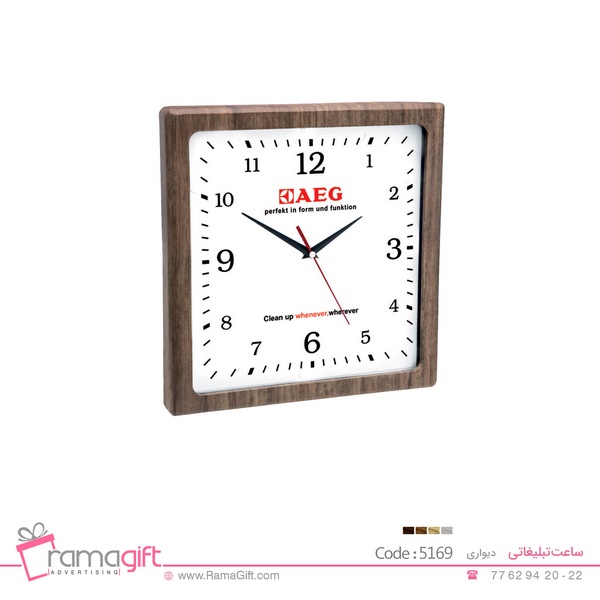ساعت دیواری تبلیغاتی کد 5169 یک ساعت تبلیغاتی جدید با بدنه چوبی است که شاید کمتر از این نوع ساعت در میان ساعتهای دیواری تبلیغاتی دیده باشیم. رنگ چوبی و قهوه ای رنگ این ساعت در ایجاد فضای صمیمی در مورد این ساعت بسیار کمک کرده است و آن را تبدیل به یک محصول دوست داشتنی کرده است. استفاده از این ساعت به دلیل جنس چوبی آن در هر نوع دکوراسیون مدرن و کلاسیک امکان پذیر است. پس تقریبا میتوانید مطمئن باشید که با انتخاب این ساعت به عنوان هدیه تبلیغاتی برای برند خود، پیامهای تبلیغاتی شما در هر فضایی دیده خواهد شد.
