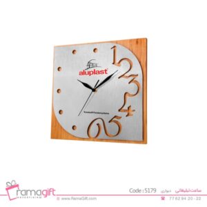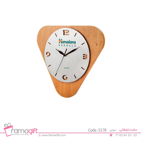 ساعت دیواری تبلیغاتی کد 5178 یکی دیگر از ساعتهای تبلیغاتی چوبی گروه راما گیفت است که همانطور که در تصویر آن مشاهده میکنید فضایی که زمان را نشان میدهد همراه با اعداد نشان دهنده زمان کاملا از بدنه اصلی جدا هستند. این نوع طراحی یک طراحی بسیار مناسب برای ساعتهای دیواری به خصوص ساعتهای دیواری تبلیغاتی است. چرا که هم باعث میشود نگاه بیننده از فضاهای دیگر به سمت ساعت کشیده شود و هم باعث بهتر دیده شدن پیامها و نوشته های تبلیغاتی بر روی ساعت میشود. از دیگر مشخصات ظاهری این محصول شکل مثلثی و خاص زمینه ساعت است که بر جذابیت و زیبایی ظاهری آن افزوده است.