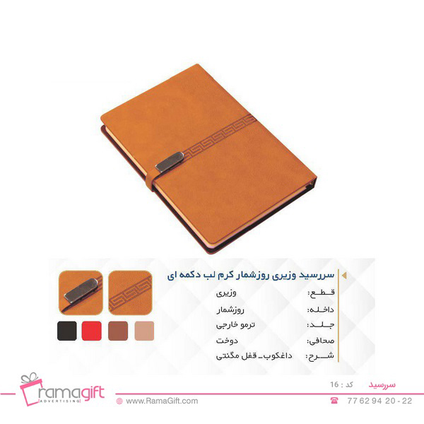 سررسید تبلیغاتی کد 16 کرم ، از خانواده هدایای تبلیغاتی میباشد. امروزه یکی از روشهای مهم و کاربردی معرفی و فروش محصولات، برندها و کالاها، ارائه هدایای تبلیغاتی به افراد مختلف جامعه میباشد. سررسيد تبليغاتی کد 16 کرم، میتواند یکی از بهترین هدایای تبلیغاتی باشد. توجه به نیاز مشتریان از ملزومات تبلیغات میباشد. هدایای تبلیغاتی موجب میشود که احساسات خوبی به افراد دست دهد و در نتیجه، توجه خاصی به کالای تبلیغ شده داشته باشند.